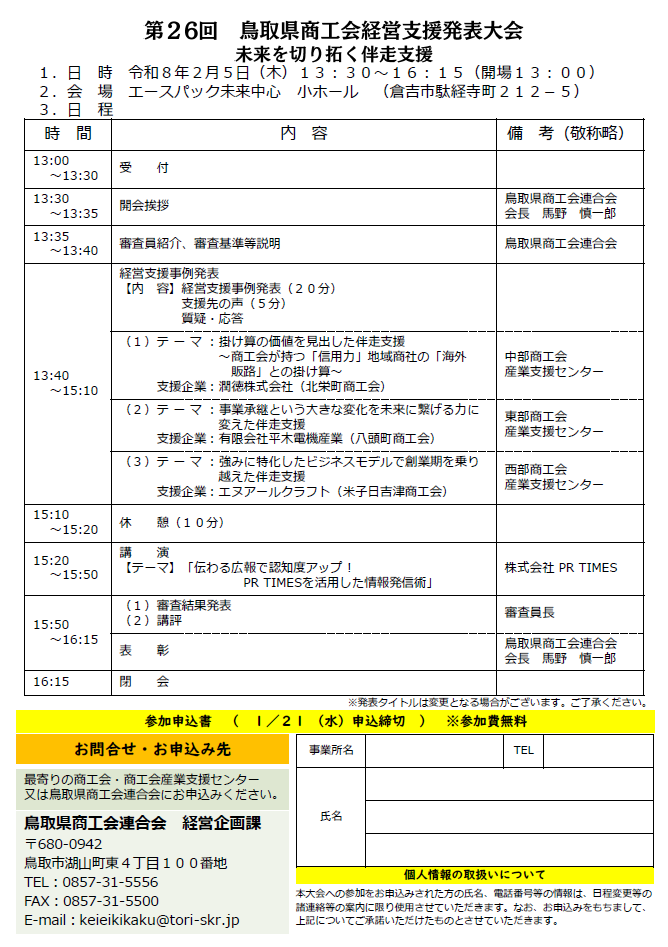 鳥取県商工会連合会 経営企画課 〒680-0942 鳥取市湖山町東4丁目100番地 TEL : 0857-31-5556 FAX : 0857-31-5500 E-mail : keieikikaku@tori-skr.jp